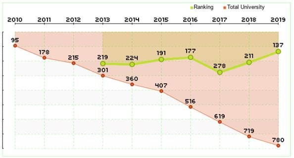 Para la medición realizada en el año 2019, la UTP ocupó a nivel mundial el puesto 137 entre 780 instituciones que se presentaron, destacando que ha sido la mejor posición ocupada en todos los años de participación de la institución en la medición. Frente al contexto nacional, se presentaron 43 universidades donde ocupamos el 6° puesto, y el 2° lugar entre las Universidades Públicas, después de la Universidad Nacional de Colombia.